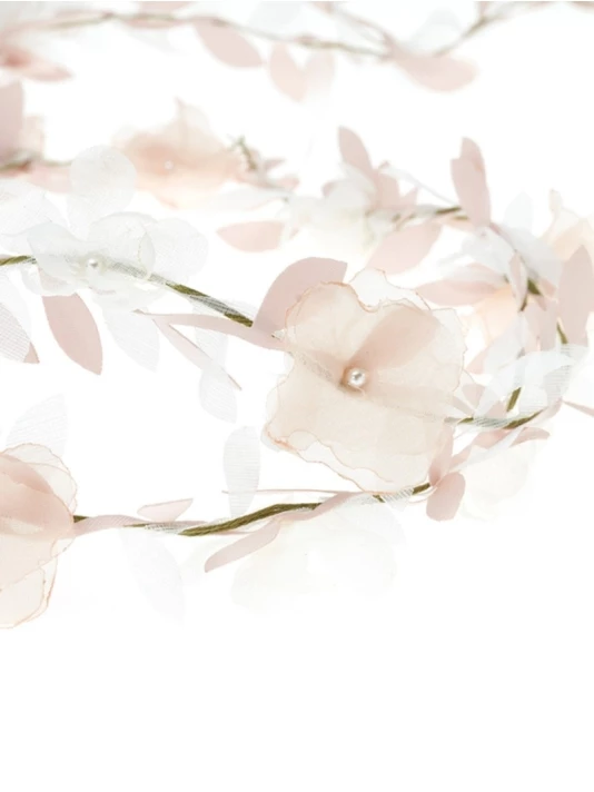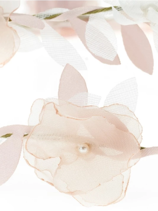 Détails: Bandeau souple en organza de couleur ivoire et blush avec une rangée de fleurs et de feuilles en organza