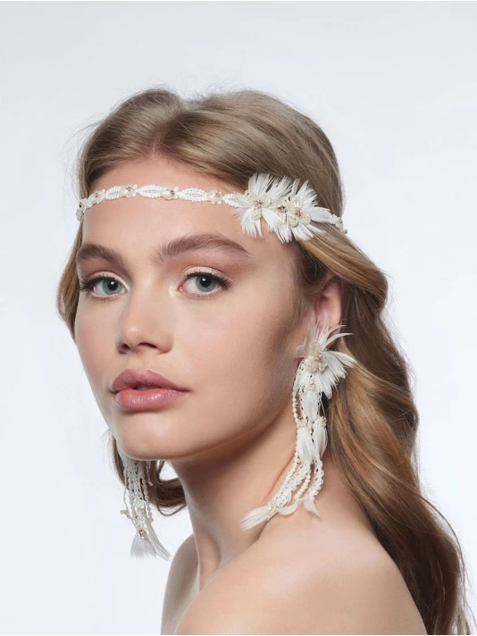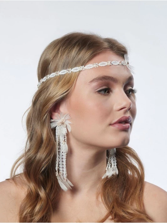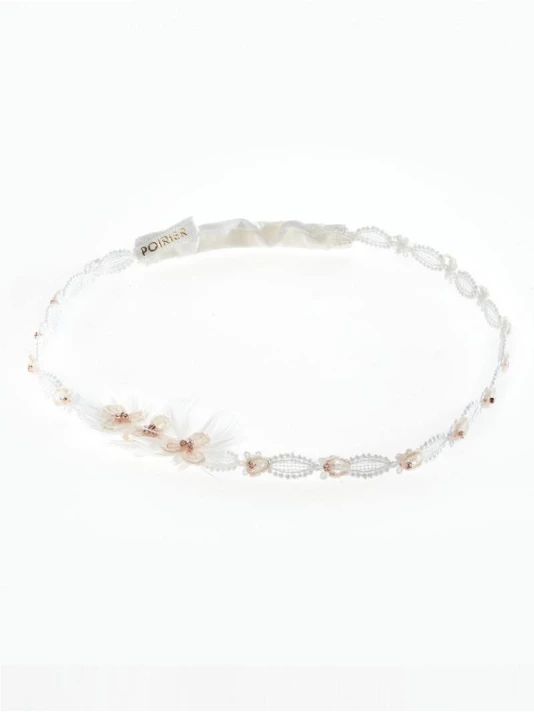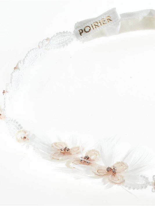 Matière: Dentelle fine ivoire, fleur en perles blush, strass et bande élastique