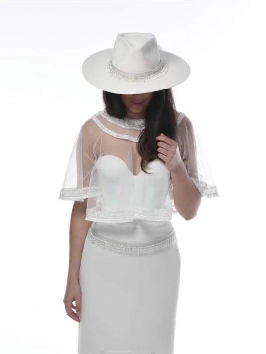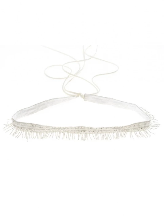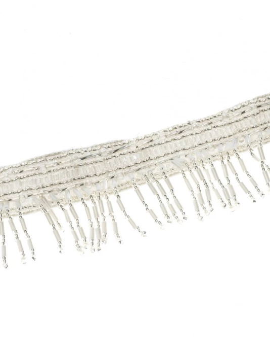 Matière: Ceinture en tissu ivoire, motif de frange de perles ivoire et argenté