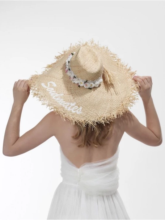 Détails: Bande de dentelle de couleur ivoire, guirlande de vraies fleurs et mot peint à la main « Soulmates »