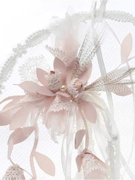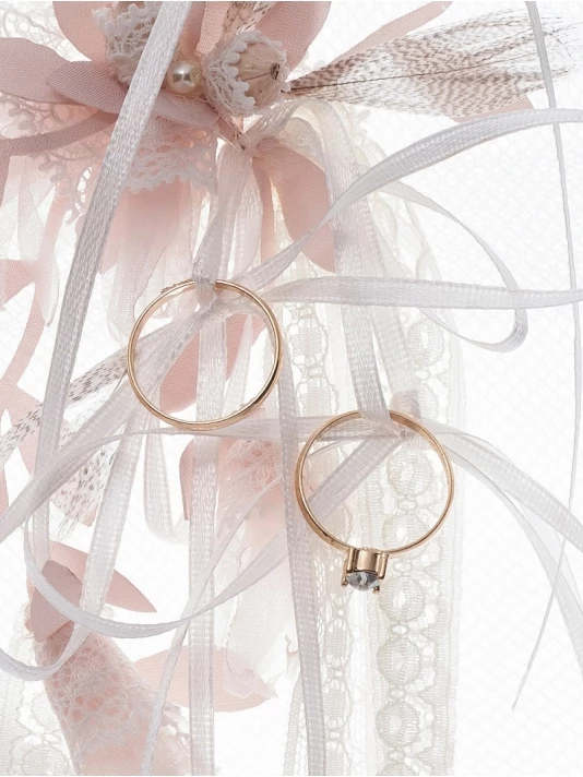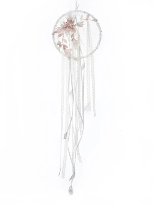 Détails: coussin à anneaux de couleur ivoire en forme d’attrape-rêves, fleurs de couleur blush, plumes