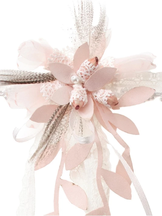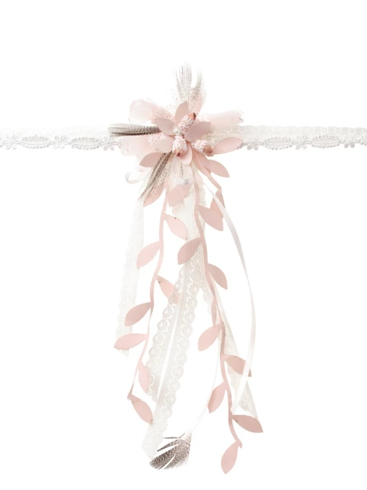 Détails: jarretière, fleurs et feuilles en blush, plumes naturelles