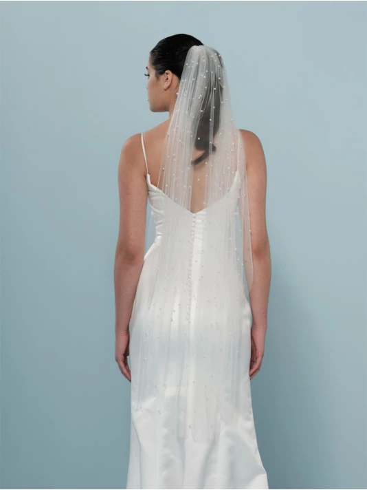 Détails: voile de soft-tule de couleur ivoire décoré de perles d’ivoire