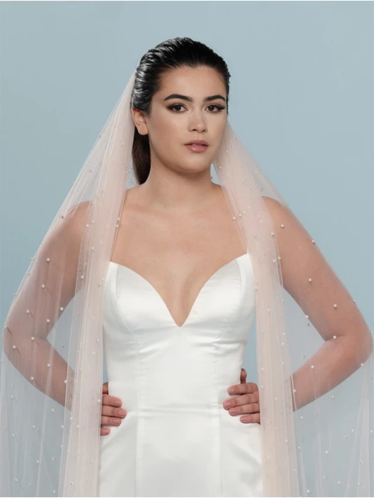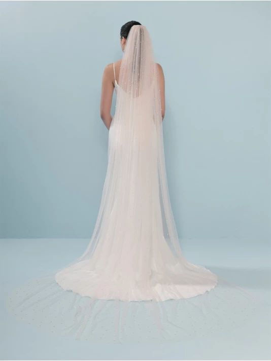 Détails: voile de tulle souple de couleur blush décoré de perles d’ivoire