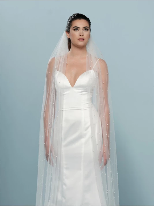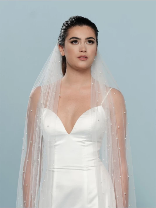 Détails: voile de tulle souple de couleur ivoire décoré de perles d’ivoire