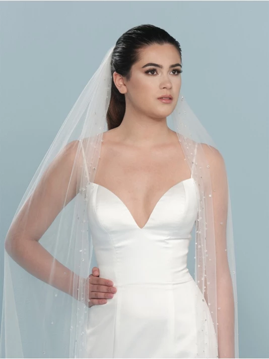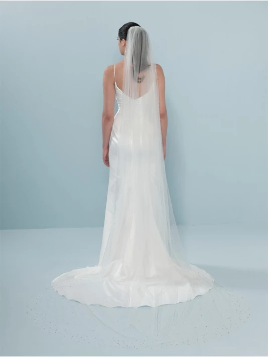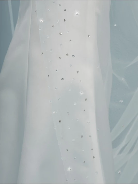 Détails: voile de tulle souple de couleur ivoire avec des paillettes argentées et des cristaux sur les bords
